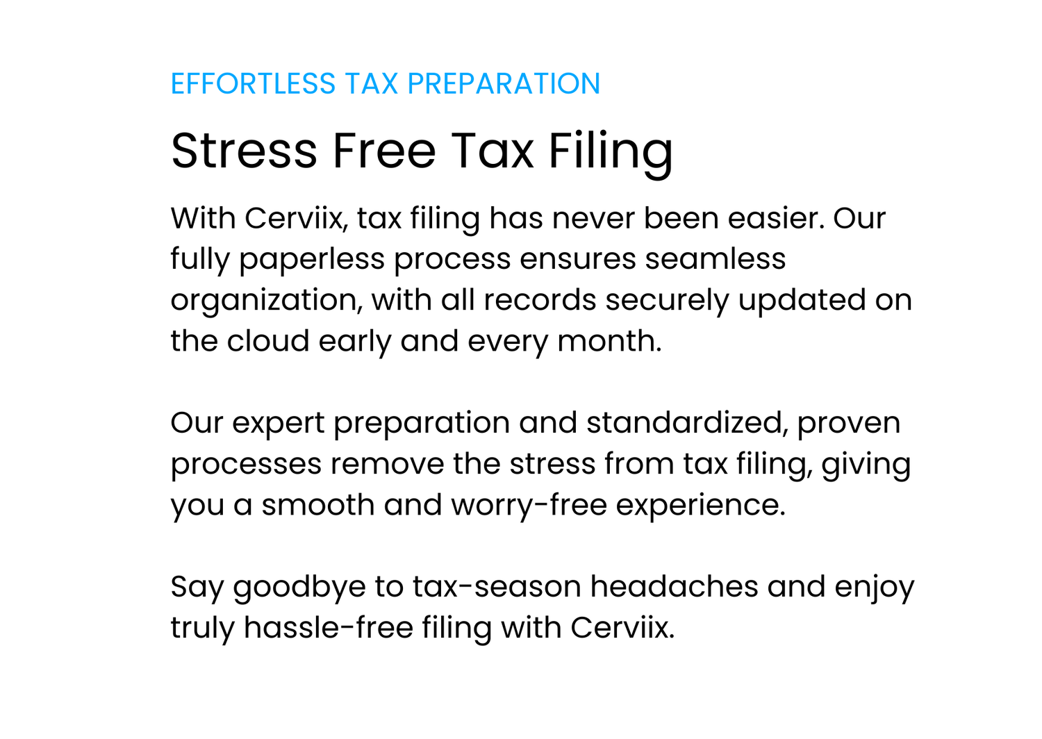“Cerviix completely transformed how we manage our finances. From accounting to tax filing, everything is seamless, clear, and stress-free. Their team truly feels like an extension of our business.”